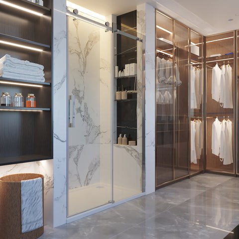 The design is meticulously planned to balance functionality with style. The recessed shelving within the shower area is a testament to this, providing ample space for essentials without cluttering the visual landscape. On the opposite side, a bespoke wardrobe area enclosed in glass allows for an organized display of attire, blending the concept of a dressing room with the bathroom. This seamless integration of different functional areas within the bathroom space is a forward-thinking approach to modern living, offering a cohesive experience where each moment and movement is considered. The result is a bathroom that doesn't just serve the daily needs but elevates them, offering an experience of everyday luxury and order.