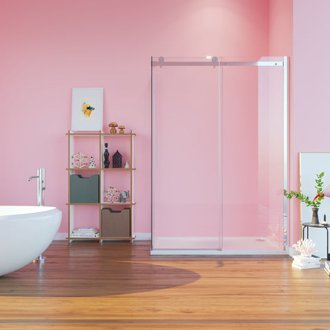 Beside the allure of the tub, the shower area is encased in a sleek, transparent enclosure that ensures the visual flow of the room remains uninterrupted. A minimalist shelf unit, with its delicate framework and open design, provides practical storage while allowing for displays of personal flair through decorative items and essential toiletries. This space is designed to be a celebration of personal style and functional simplicity, where each element, from the floor to the furnishings, contributes to an overall aesthetic that is as refreshing as it is stylish. The result is a bathroom that not only serves its purpose but also elevates the mood of those who enter, offering an uplifting start to the day or a cheerful retreat in the evening.
